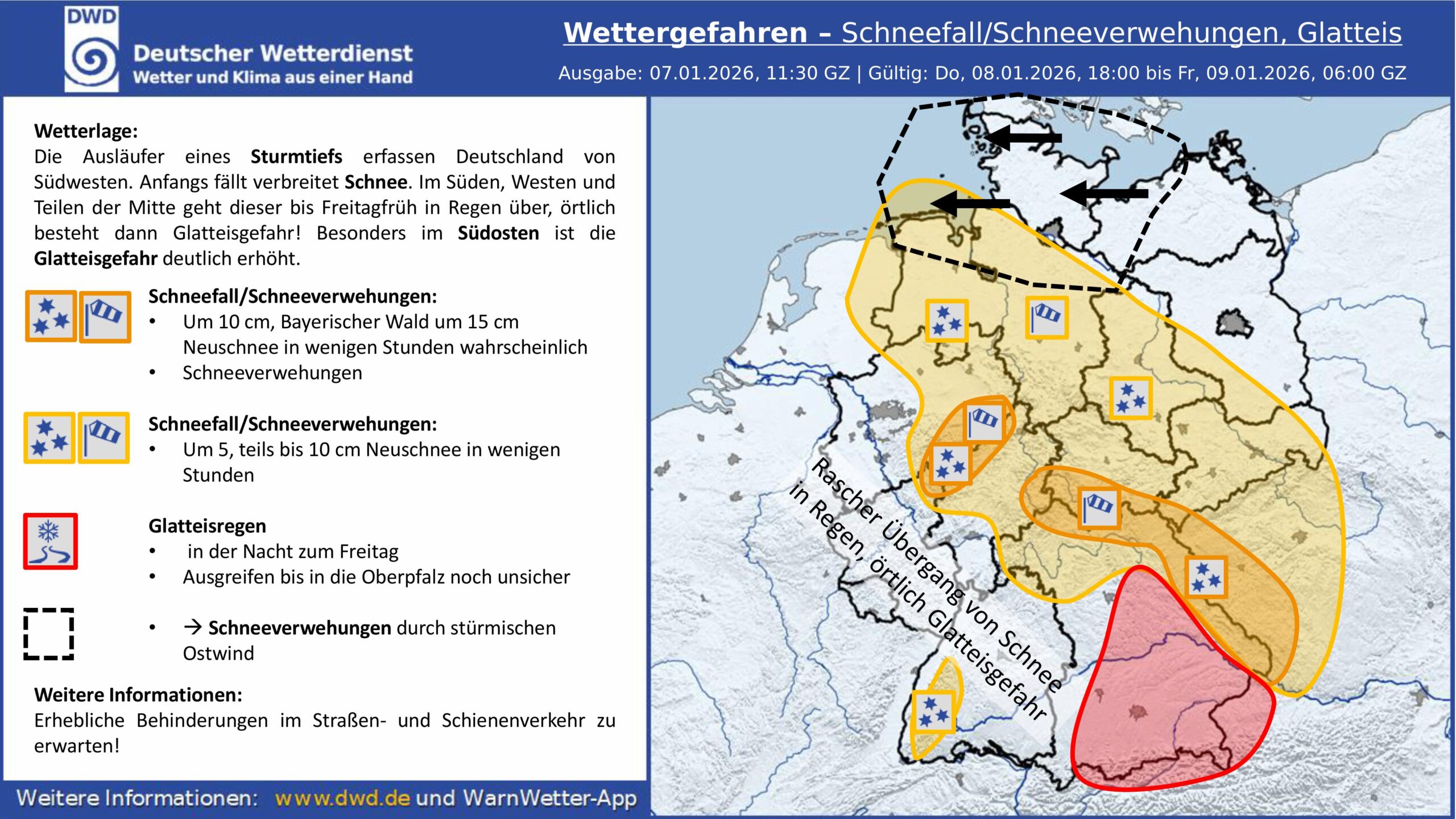Sehr geehrte Damen und Herren, Liebe Bürgerinnen und Bürger, den Hinweis auf die Gefahren von Schnee und Glatteis von Donnerstag, 08.01.2026, 18.00 Uhr bis Freitag, 09.01.2026, 06.00 Uhr übersenden wir zu Ihrer Information und entsprechender Beachtung!